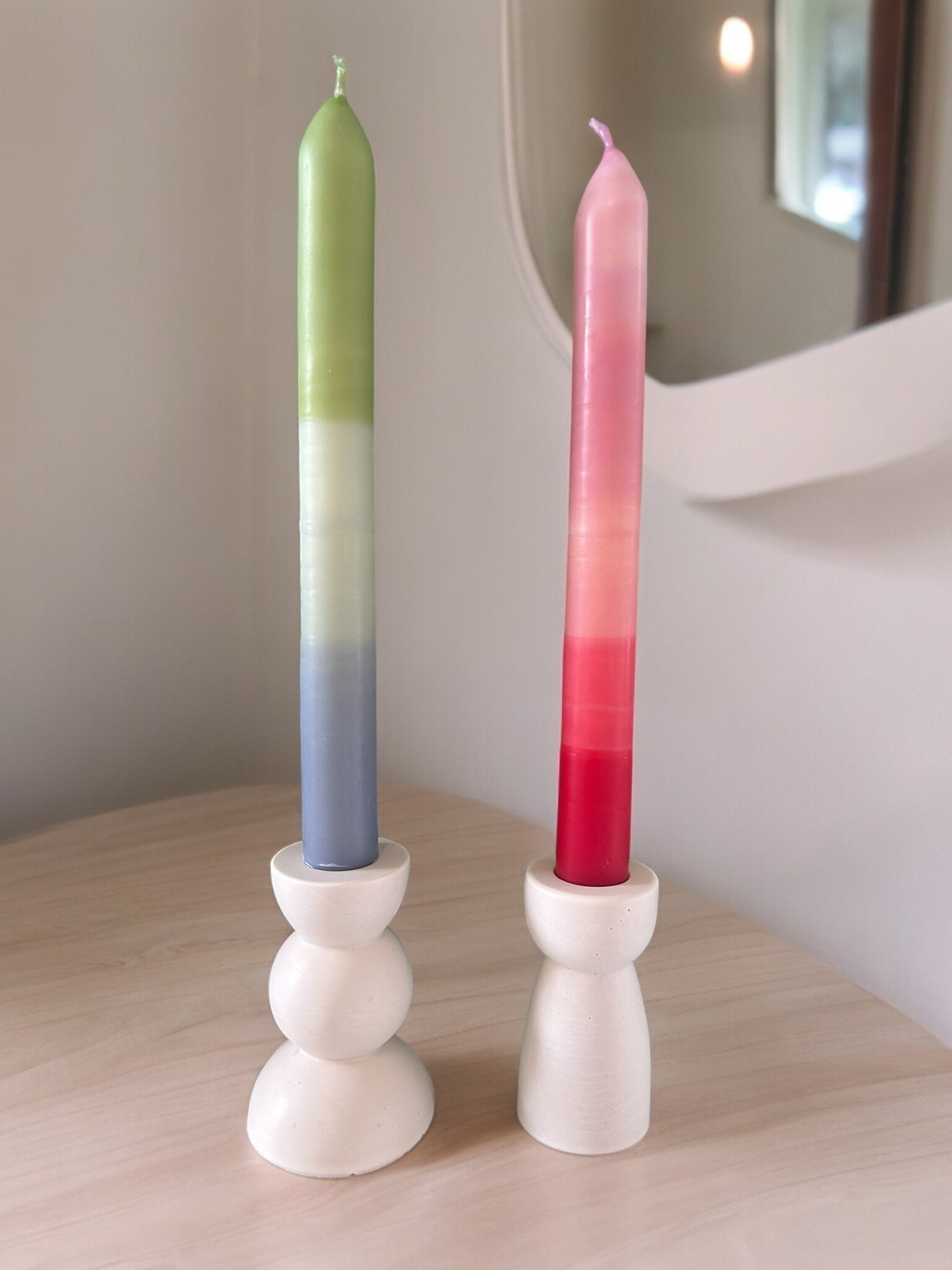 - We versieren twee dinerkaarsen met een dippingtechniek en maken bijpassende kandelaars van ecologische acrylhars.